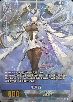 顏 色 藍 種 類 艦船卡 費 用 7 戰 力 600 陣 營 白鷹 艦船類型 戰列 罕 貴 UR 勢 力 碧藍航線 支援類型 戰場 支援值 - 卡牌效果 ■【對方回合中】戰場上的此卡支援+400。 ■【攻擊時】公開己方卡組最上方的4張卡,而後將其以隨機順序置於卡組最下方。公開的卡牌中每出現1張《白鷹》艦船卡,本次戰鬥中,此卡戰力+100。