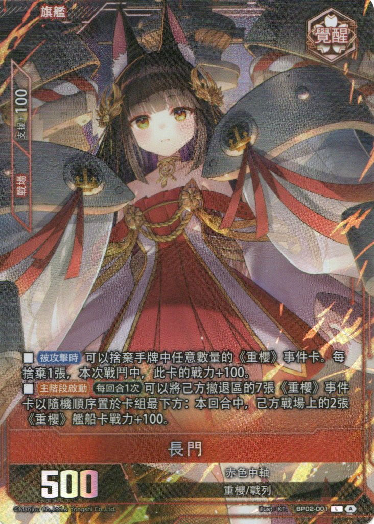 顏 色 紅 種 類 旗艦卡 費 用 - 戰 力 400 陣 營 重櫻 艦船類型 戰列 罕 貴 L 勢 力 赤色中軸 支援類型 戰場 支援值 100 卡牌效果 ■【被攻擊時】可以捨棄手牌中任意數量的《重櫻》事件卡。每捨棄1張,本次戰鬥中,此卡的戰力+100。 ■【覺醒】己方的旗艦耐久為1或以下時,將此卡轉為反面。 顏 色 紅 種 類 旗艦卡-覺醒 費 用 - 戰 力 500 陣 營 重櫻 艦船類型 戰列 罕 貴 L 勢 力 赤色中軸 支援類型 戰場 支援值 100 卡牌效果 ■【被攻擊時】可以捨棄手牌中任意數量手牌的《重櫻》事件卡。每捨棄1張,本次戰鬥中,此卡的戰力+100。 ■【主階段啟動】【每回合1次】將己方撤退區的7張《重櫻》事件卡以隨機順序置於卡組最下方:本回合中,己方戰場上的2張《重櫻》艦船卡戰力+100。