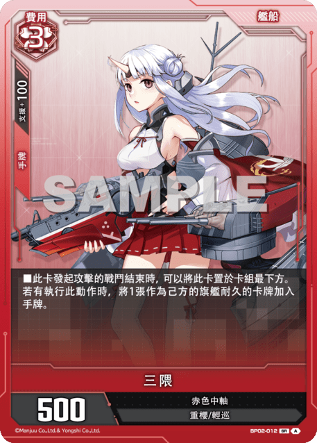 顏 色 紅 種 類 艦船卡 費 用 3 戰 力 500 陣 營 重櫻 艦船類型 輕巡 罕 貴 SR 勢 力 赤色中軸 支援類型 手牌 支援值 100 卡牌效果 ■此卡發起攻擊的戰鬥結束時,可以將此卡置於卡組最下方。若有執行此動作時,將1張作為己方的旗艦耐久的卡牌加入手牌。
